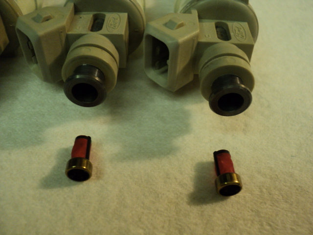 When that process played itself out, I set about trying to use "The Old Set-Screw in a Vise" method to pull the old EFI filter baskets out of the noses of each one, No soap. I could NOT get them to budge no matter how much I turned and twisted and tugged on them using my very considerable strength. STILL ...No Go. Then I resorted to using my tried and true Red "RPG" looking, hardened tipped slide hammer puller... and they came out like butter! I was surprised to see that the filter basket design inside came out looking like "Merlin's Hat" from Walt Disney's Classic cartoon, "The Sorcerer's Apprentice"...sort of like they took a single piece of SS screen, folded it in half and then spot weld it along both sides from the top down, narrowing it into a cone. These looked primitive by the GM standards and their smaller dimensions forced me to switch from using the longer, slender black plastic/SS screen GM replacements for the four Red Nippon-Denso ones which were a bit shorter, but offered a wider barrel dimension closer to the top and uniform in its shape with a larger area of screen in view. First I cleaned out the top of the insert area of each injector with cotton swabs and then used a S/S micrometer depth gauge, discovering that the internal components began at around a depth of 11.36 mm inside each EFI. Without knowing whether the pintles actuate upward to open and downwards to open and close, I was reluctant to put in filter baskets that perhaps were too long inside and be risk being impacted by the moving internal parts of the working pintles in action. Fortunately, the new Nippon-Denso Brass Insert Ferrules hammered in nicely after I swabbed the inside upper chamber first to remove any traces of dirt or small brass ferrule tailings and they looked perfect when I finished installing each new filter basket.