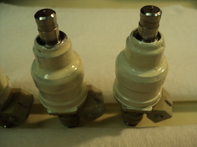 Next, I followed the "orders of operation" during assembly by first placing the new, yellow plastic separator ring over the nozzles, followed by the new, brown Viton "O" Rings. Finally, I rifled through my SAE and Metric socket sets for just the right size socket to place the heated plastic pintle caps inside of and it turns out that a 9MM 3/8" drive socket was a perfect fit! (See side by side pics) Next... I borrowed the wife's "Hair Fryer...uh err I meant "Hair Dryer" and with the socket sitting flush on the counter, I doused the pintle cap as it was laying inside the 9 mill socket for just a few seconds to soften the plastic enough to just pop the injector on and Voila! DUNN. I repeated this action for all four injectors and topped off each of the filtration in-ports with the remaining Viton "O"Rings to complete the job. I don't know... I think they look pretty damned good... and so tomorrow... I'll bring "Frank" outside, fire him up and we'll put these four (4) Ford EFI Puppies through their paces with several Pressure Cleanings and Flow Balance Test to see if they "Work as Good as they Look" As ever, I will videotape these actions so you will be seeing what I see as they get the Royal, Loyal Treatment on... "The FrankInjector Machine"
