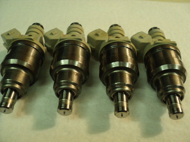 Today, I went about the task of using a cheap, break-off razor blade knife to slice through the old, brittle plastic pintle caps, "O" Rings and plastic separators and slid them off the nose of each of the four EFIs. You will see from the photos I took that indeed, shows there is a very delicate metal pin sticking out of the nozzle that is sharp enough to puncture your hands if you squeeze the EFI hard while working with its disassembly and reassembling. From there, I carefully laid these four EFIs down inside the "Fried Chicken Basket" of my Eumax Ultrasonic Cleaner, covered them well enough with some fresh and undiluted "Purple Power", set the heating temperature for 55 degrees centigrade and the timer for a 30 minute cleaning session. I noted that prior to putting the dirty, filthy things in there that some of the grey factory paint had flaked off of the body and what looked like rust had migrated under the paint over time. Unlike the charcoal-grey, anodised bodies of the GM Multec EFIs, I discovered after removed the basket with these steaming hot injectors that they started to rust rapidly on contact with air. I made a mad dash to the garage, grabbed my trusty can of Kroil Rust Killer and sprayed the body of each injector well enough to minimise the metal oxidation and get things under control. After stopping the bleeding, so to speak, I had to come up with a plan for re-cleaning and sealing the steel body of each injector. I first used some heavy steel-wool and then some Brillo pad to scrub and de-rust those barrels while avoiding breaking off the pintles inside the noses of the things. I then remembered using that "Sheffield" stuff and thought I might be able to simply clean the metal bodies with some spray solvent and then immediately apply a decent coat of the tan porcelain paint to the outside of each EFI and solve the problem with something that was not only a chip-proof, porcelain finish (shiny and hard) but also heat proof to 400 degrees Fahrenheit. You can see from the images that it worked out well, even though I had to stand the EFIs on their heads and let the stuff harden and air dry for over three hours before I could continue the work.