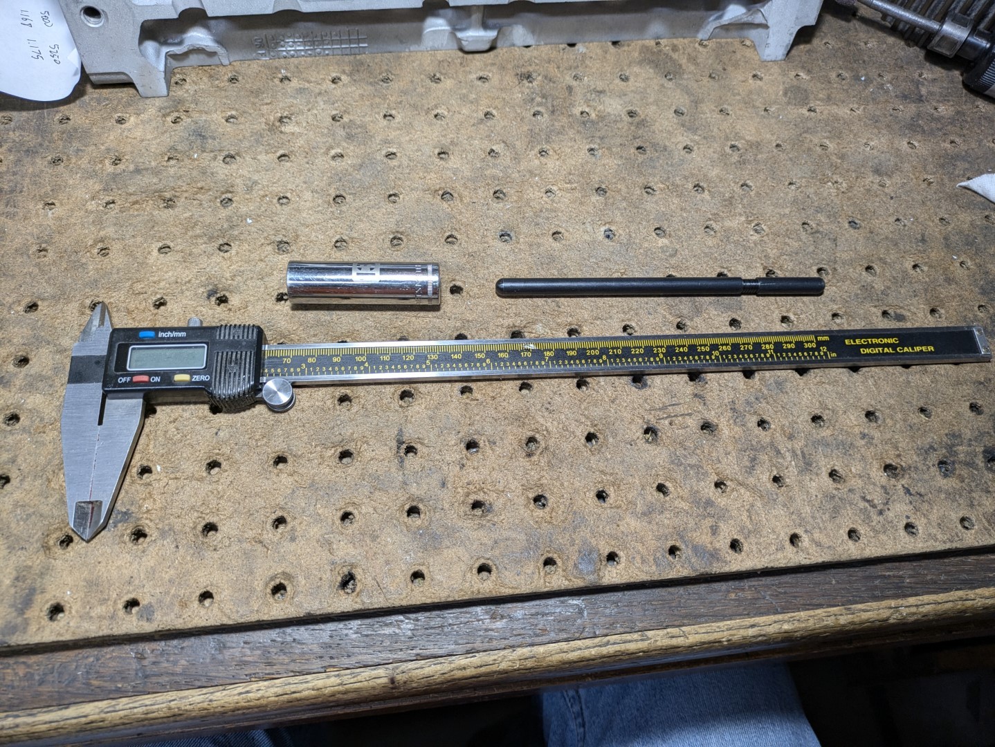 Besides the adjustable pushrod, you will need a 12" caliper or other accurate measuring device that is accurate to .001", and a socker for the nut/stud holding the rocker down. For this example, we are using a Gen 2 2.8 V6 with flat tappet cam and pushrod guideplates. The nut holding the rocker is 13mm
