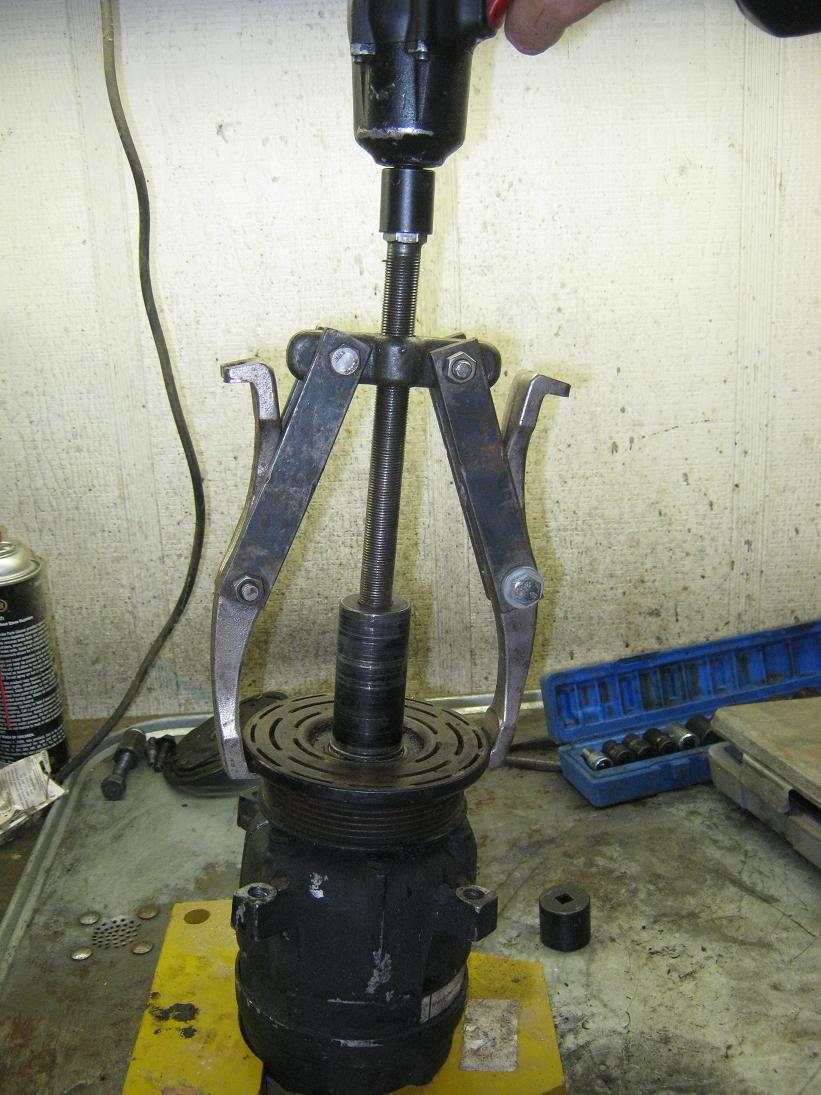 Install a puller, making sure the puller bolt ONLY presses on the neck of the compressor, NOT the shaft. The socket sits on the neck, protecting the shaft.