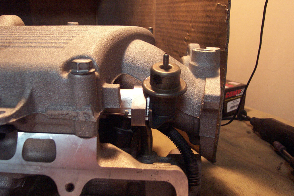 I will have the spacers tomorrow to complete these, but I have pics so you can see what the deal is with this piece. Rotating the Fuel Pressure Regulator allows you to use the gen 3 fuel rail and clear the 3500 plenum. This will also work for the 3500 plenum swap on a 3400 lower.