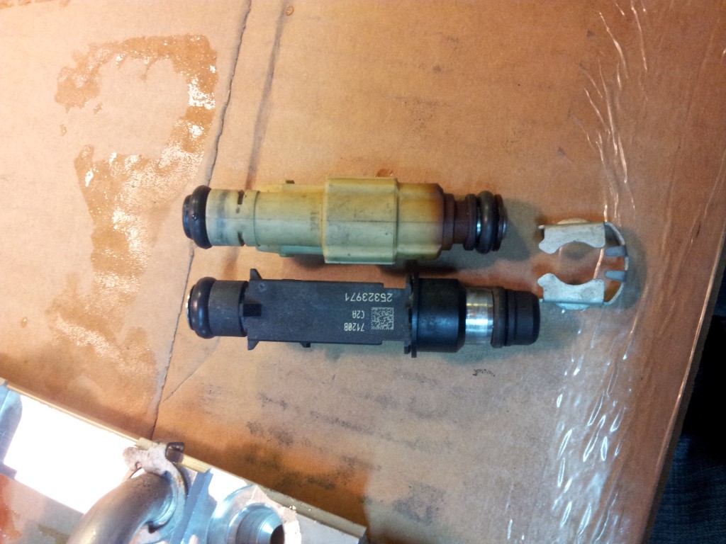 Multec 1 3400 injector vs L67 injector. The main part of this is the identical length, but the notch for the injector clip doesn't go all the way around the L67 injector (white) where the stock injector does. Use cut off wheel, bandsaw, saw blade, etc to make the notch go all the way around and thats it for this swap.
