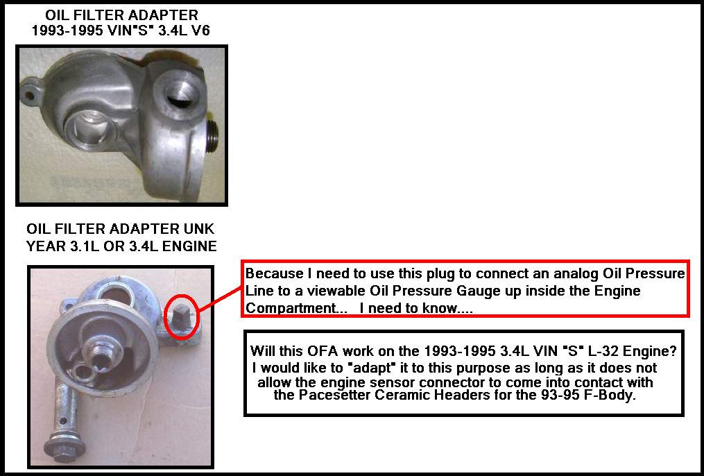 On finishing the assembly of a 95 3.4L L-32 V6 being installed in a 1994 Camaro...I was hoping to be able to attach an oil line to the Aluminum Oil Filter Adapter somewhere on the housing for viewing an Analog Oil Pressure Gauge in the Engine Compartment...but the only port on the stock adapter is for the Oil Pressure Sensor... but as close as everything is down there, what with the "Heat Booty" and OPS harness almost touching the left side of the engine well...I am thinking about using a different Oil Pump Adapter to get both things to work.