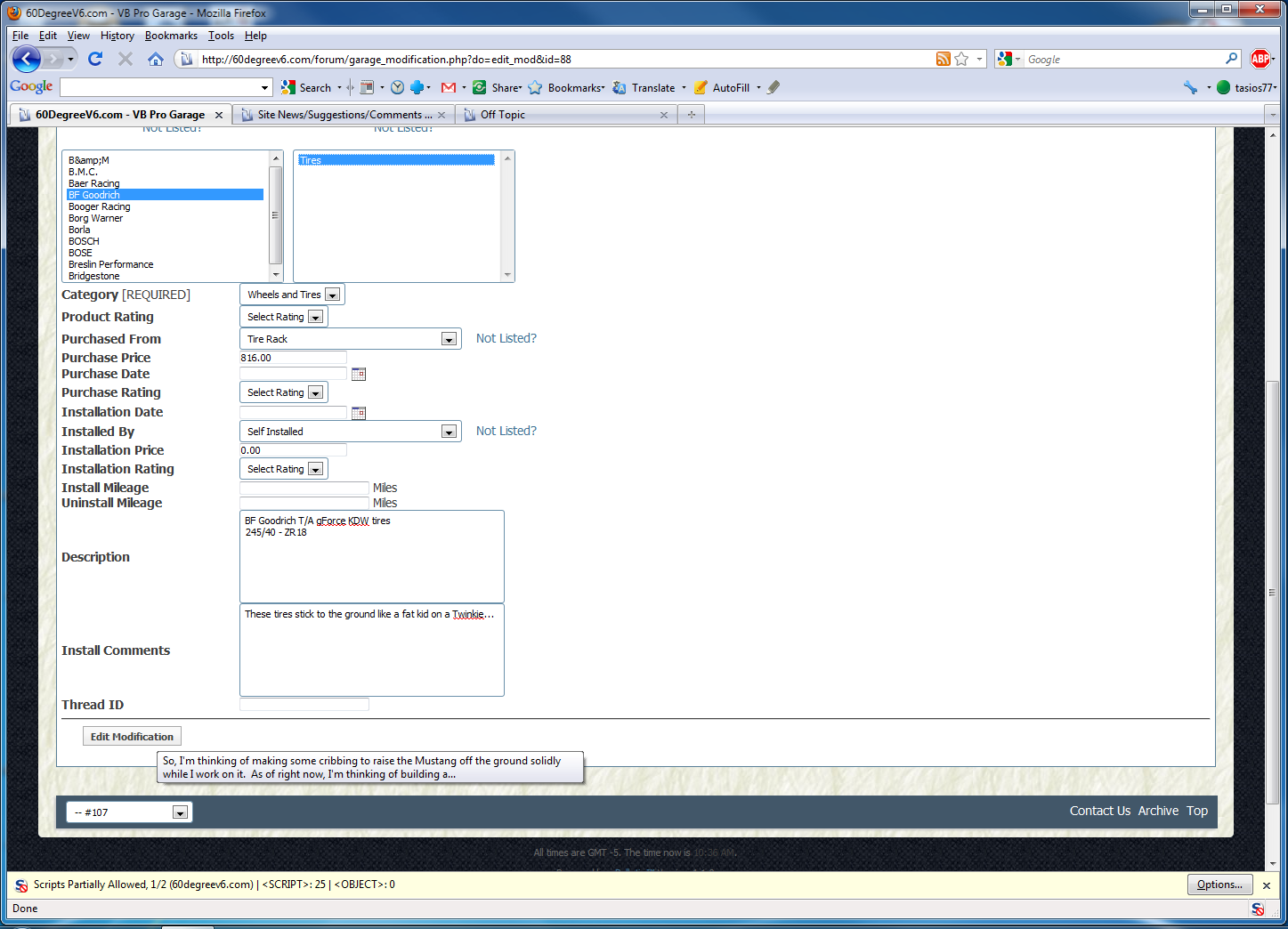 So I was randomly going through the garage and ended up checking out the page for my car. I found the tires in the mods section read Goodyear when in fact they are BF Goodrich's, so I clicked edit, corrected it and moved my mouse over the Edit Modification button and saw this...